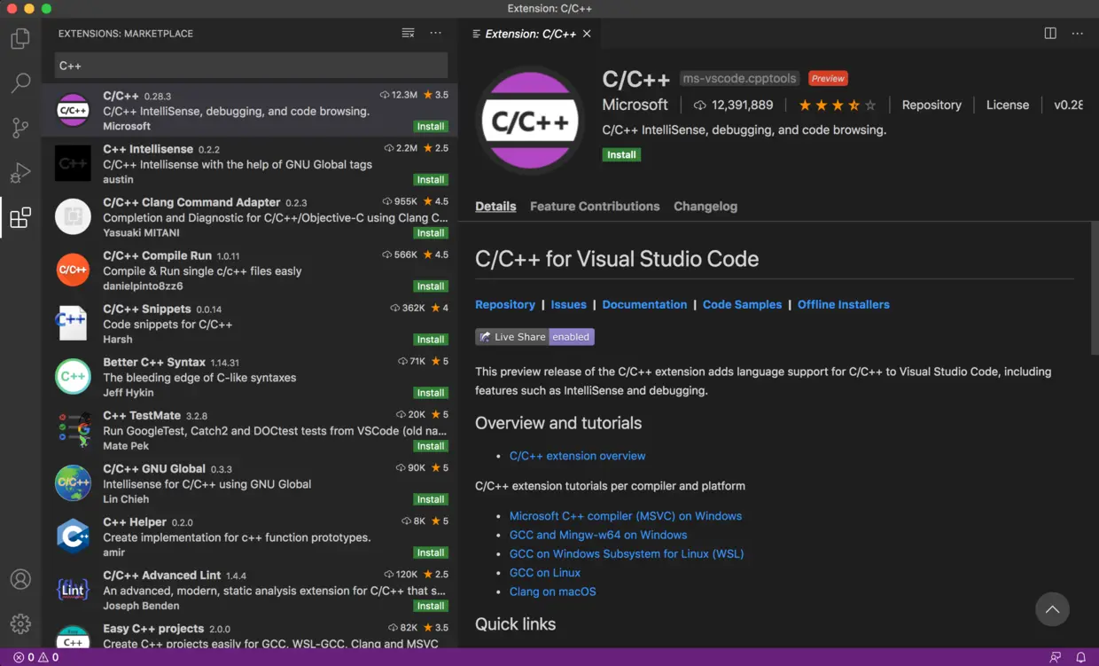 打开 VS Code 后,针对某种编程语言例如 C++,只需要安装对应的官方插件(由微软开发),即可运行和调试该语言,也就是摇身一变成为该语言的 IDE 了。