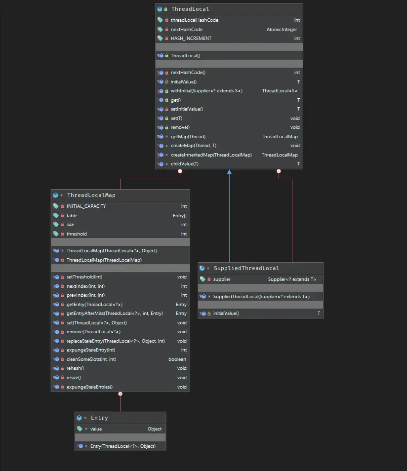 ThreadLocalMap是ThreadLocal的内部类,实现了一套自己的Map结构,咱们看一下内部的继承关系就一目了然。