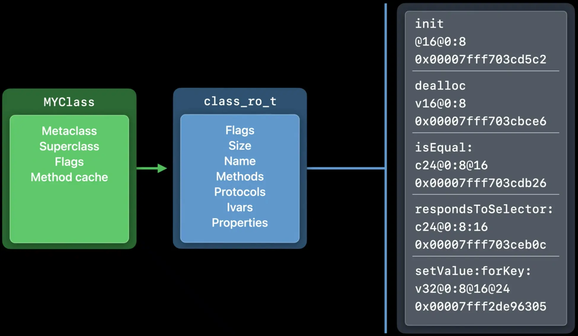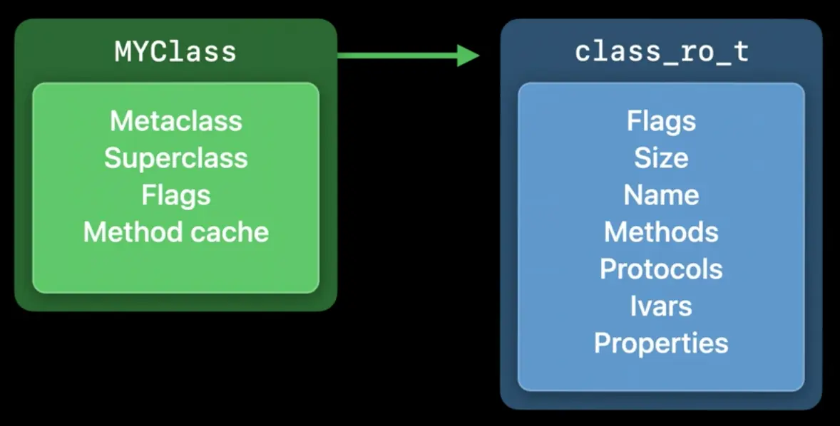 这个类对象包含了最常用的信息:指向元类、父类、以及方法的缓存。它还有一个指针指向更多的额外信息class_ro_t,其中 ro表示read only 。这部分信息是只读的,其中包含了类名、方法、协议、实例变量和属性等信息。Swift类和Objective-C类均使用这个结构。