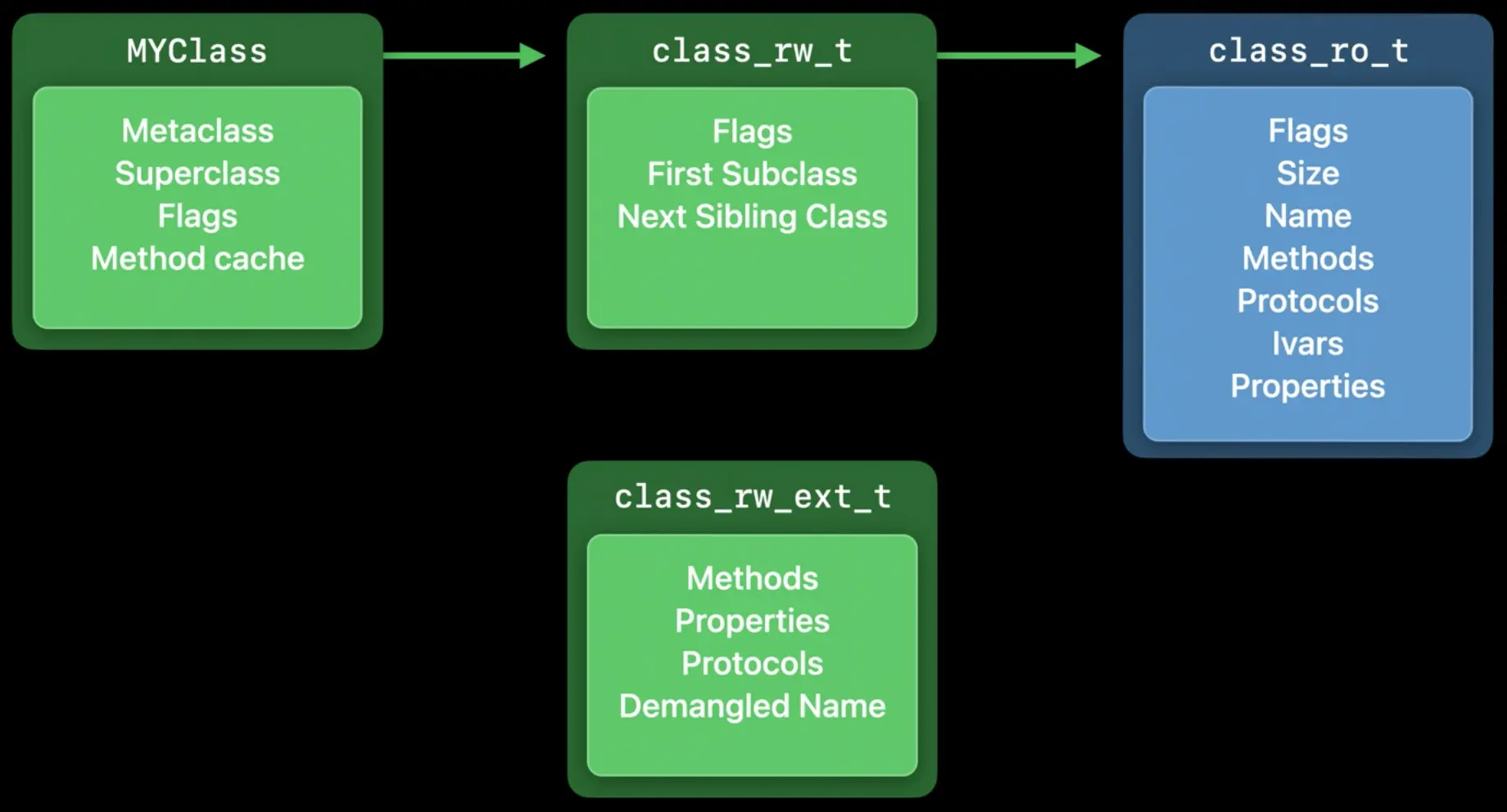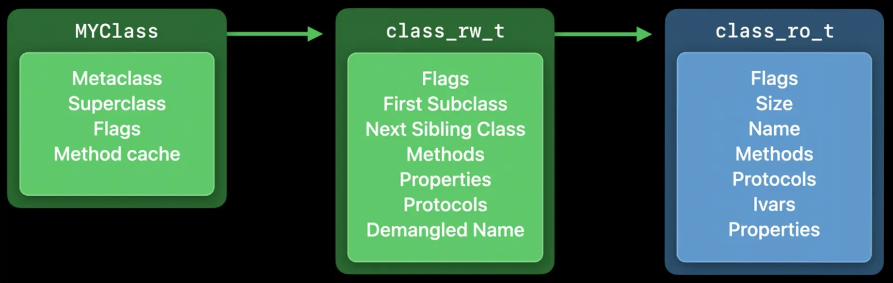 - First Subclass 和 Next Sibling Class 指针让运行时可以遍历当前使用的所有类。