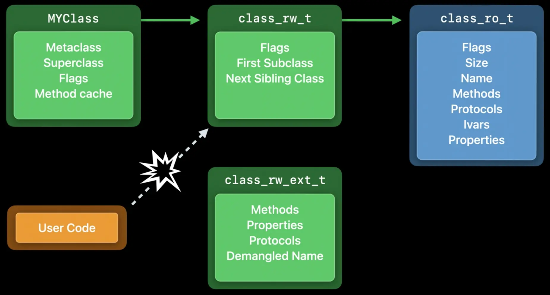 如果原来的代码直接访问class_rw_t结构,由于结构内存布局发生了变化,可能产生崩溃。苹果推荐使用运行时API,这样底层的细节会由他们处理。
