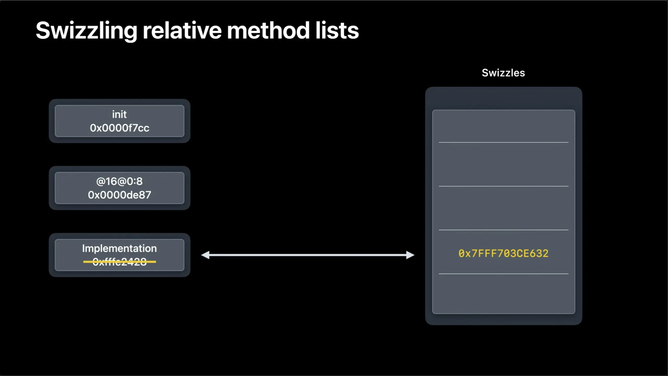 苹果会在一个全局表中映射交换的实现。由于交换并不是非常常见的操作,所以这个全局表也不会特别大。