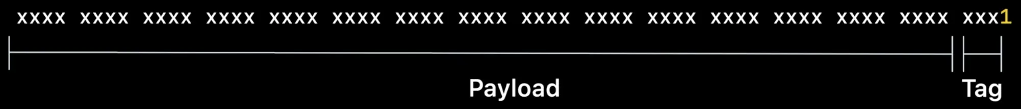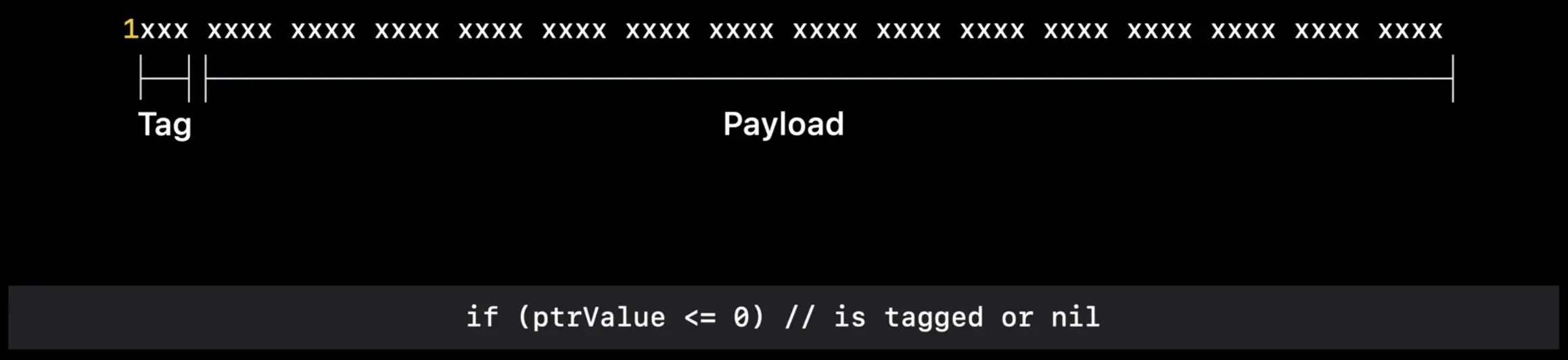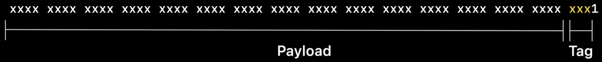 iOS 14中tag号被移动到了低位。对于现有的工具,例如动态链接器,对于指针的高8位,ARM的特性 Top Biyte Ignore 会直接被忽略。苹果把扩展部分放在了 Top Biyte Ignore 生效的部分。对于字节对齐的指针,低3位总是0,刚好放下3位的tag号。最终,带来的一个有趣的效果就是,一个标记指针的payload中就可以放下一个普通指针了。这就让一个标记指针可以指向一个常量,例如字符串或者其他可能占用 Dirty Memory 的数据结构。