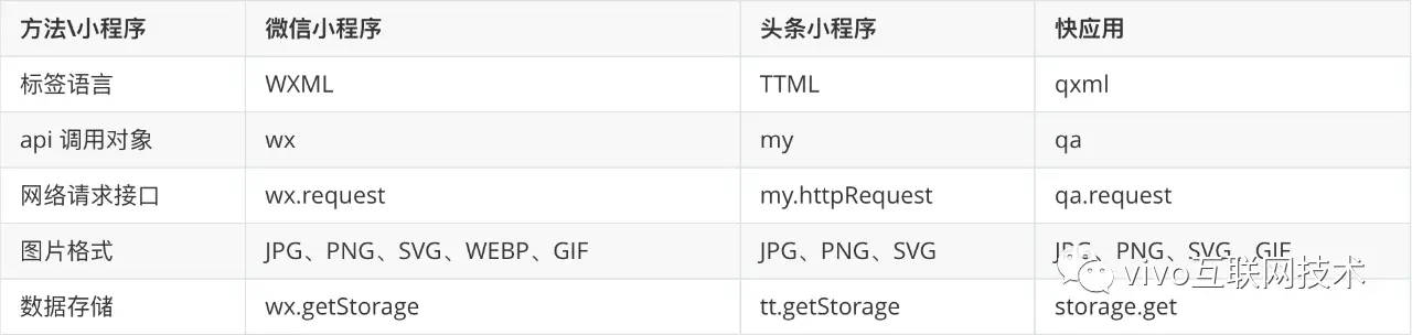 目前,各个小程序的技术各不相同,举个例子,我们罗列下不同小程序和快应用核心 api 的使用方式。