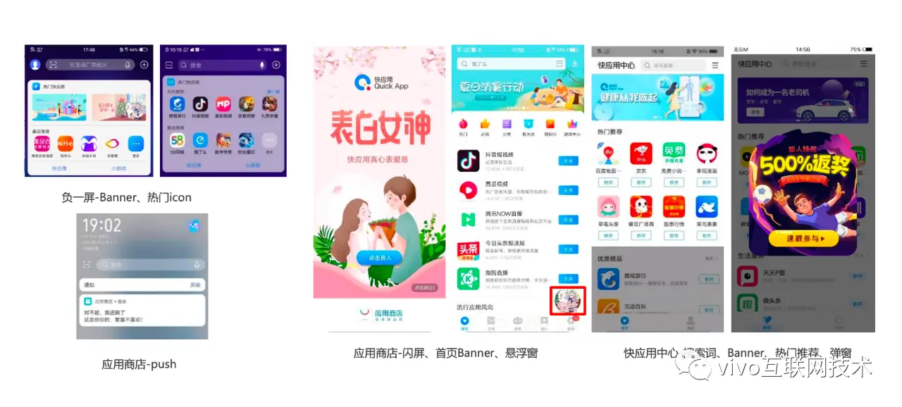 本次多端探索的重点是对快应用的快速支撑。快应用是由 11 家手机厂商联合推出,投入流量超 10 亿,同时在多家手机终端曝光导流。vivo 提供给快应用海量入口级资源曝光,包括负一屏、智慧场景、应用商店、浏览器等。