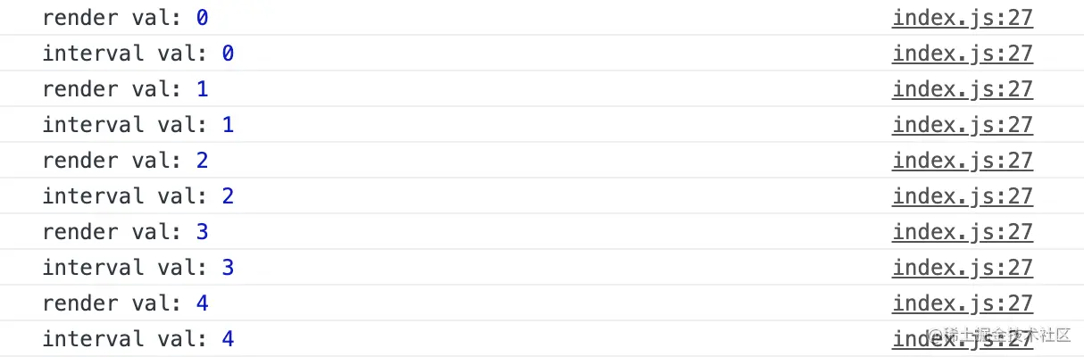 在下一个示例中添加打印 count,会很神奇的发现,每次重新 render,读取到的 count 都是最新的,而 setInterval 每次中都还是 0。而他们都出现在同一个作用域中,作用域只有一个 count,按道理每次都应该读到最新的 count 不是吗?