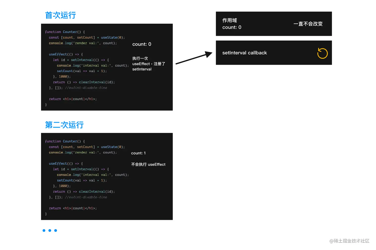 所以,当程序运行起来是,setInterval 内的闭包引用到的一直是最初的 count,而 useState 得到的是最新的 count。这是两处代码打印出来结果不一致的根本原因。