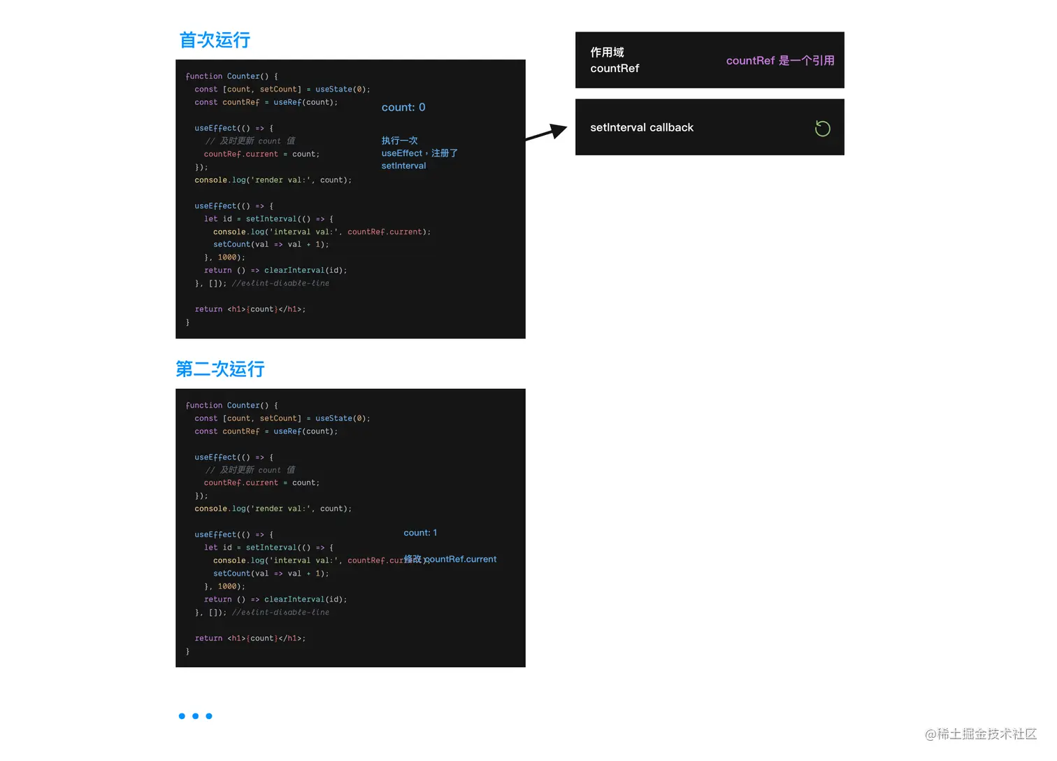 借助 useRef,每次都把最新的值赋予 countRef.current = count;,闭包内原本获取 count 的位置,改成 countRef.current。这时候闭包引用的是一个 Object,当它被真正运行起来时就是通过对象的引用而不是一个基础数据类型的值。