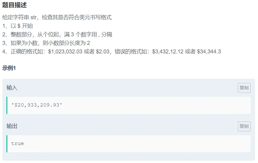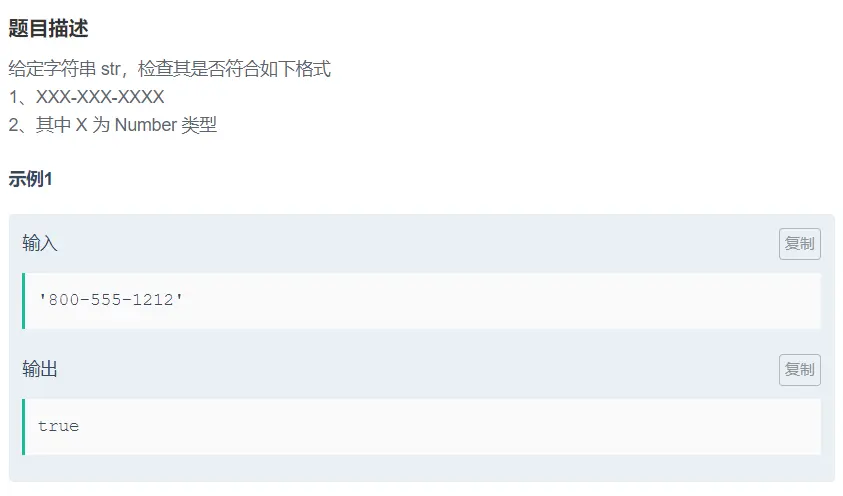 本题需要注意格式,开头 ^ 和结尾 $ 必须加上来限定字符串,3个数可表示为\d{3},4个数则为\d{4},{n}表示前面内容出现的次数。正则表达式可写作 /^ \d{3}-\d{3}-\d{4}$ / ,有相同部分\d{3}-,因此也可写作 /^(\d{3}-){2}\d{4}$/ 。