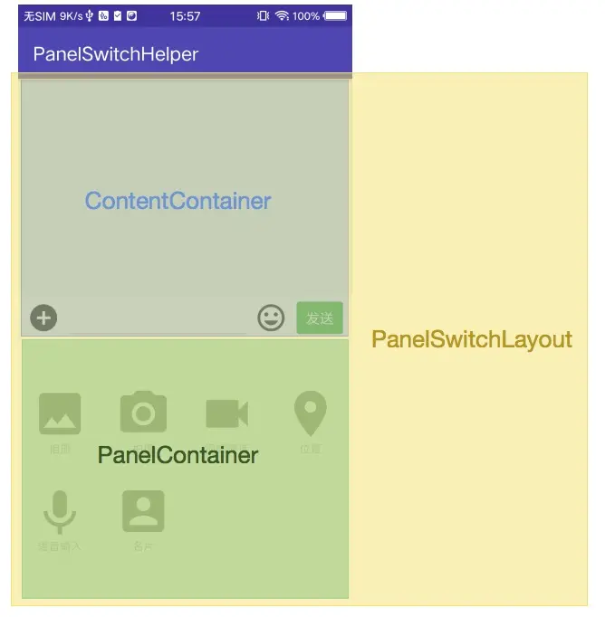 PanelSwitchLayout总容器,用于在软键盘/面板显示时干预 onLayout 进行协调控制;LinearContentContainer线性内容区域(更多内容容器可参考库提供及自定义扩展),软键盘/面板显示后动态调整的区域;PanelContainer面板区域,用于容纳及显示业务的所有面板。