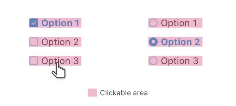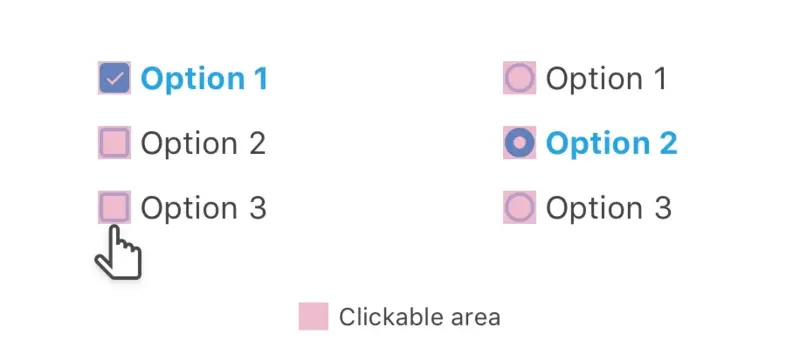 然后,在<label>元素上添加padding,以使可点击区域变大。 这样,问题得以解决,整个复选框或单选按钮都是可单击的,如下图所