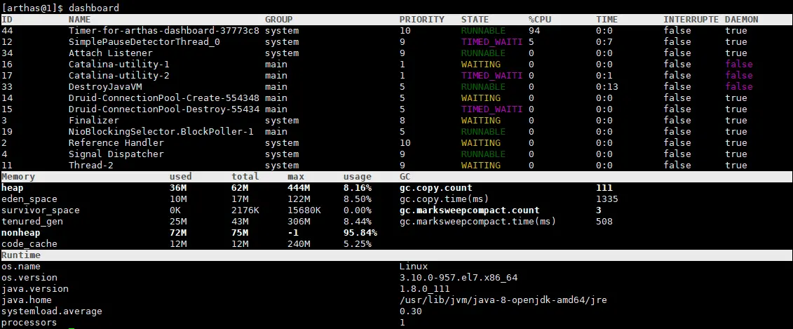 使用dashboard命令可以显示当前系统的实时数据面板,包括线程信息、JVM内存信息及JVM运行时参数。