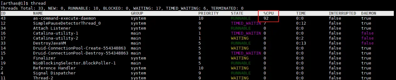 查看当前线程信息,查看线程的堆栈,可以找出当前最占CPU的线程。