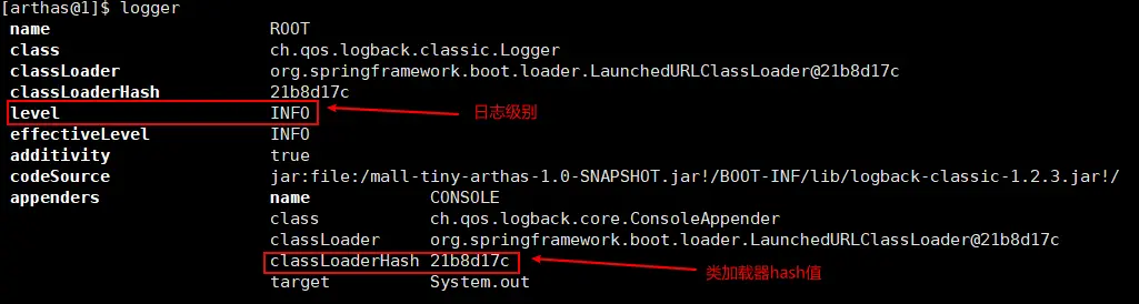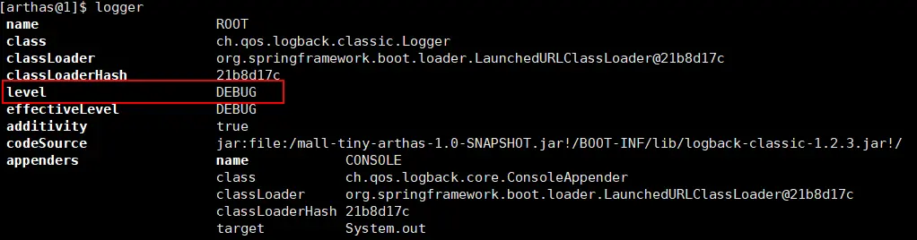 docker logs -f mall-tiny-arthas命令查看容器日志,发现已经打印了DEBUG级别的日志;