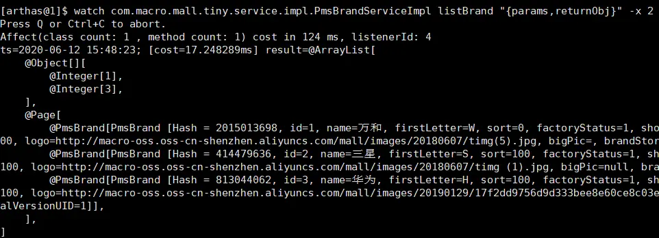 watch com.macro.mall.tiny.service.impl.PmsBrandServiceImpl listBrand "{params,returnObj}" -x 2