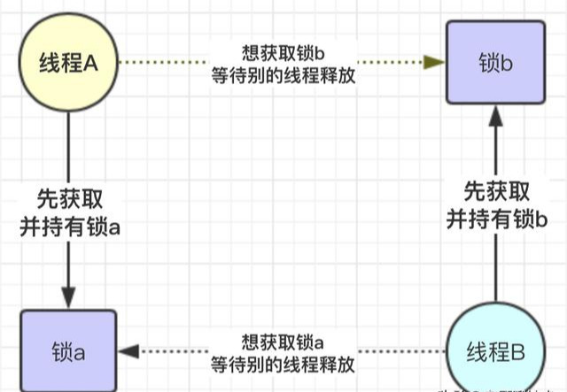 死锁的本质,举个例子如果此时有一个线程 A ,按照先获持有锁 a 再获取锁 b的顺序获得锁,同时另外一个线程 B,按照先获取锁 b 再获取锁 a 的顺序获取锁。如下图所示: