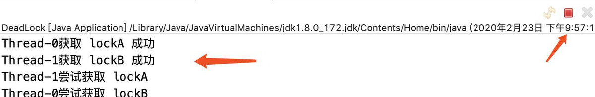 查看打印结果,我们发现 线程0 获取成功然后线程1才能继续获取