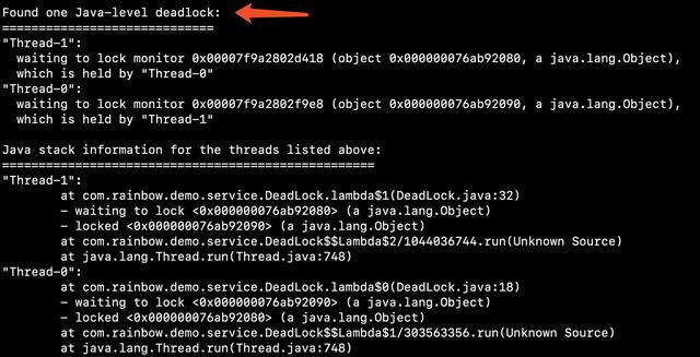 $ jstack 96521从上面的堆栈信息中我们可以发现这个内容:“Found one Java-level deadlock”,表示程序中发现了一个死锁,后面包含跟多详细的信息,重点下面: