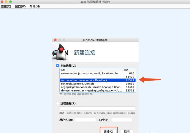 $ jconsole可以看到我们的程序,点击连接。