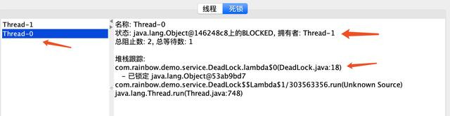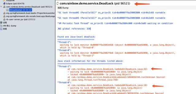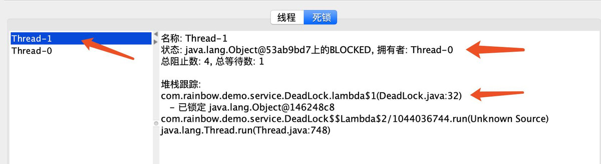 上图中可以看到详细的死锁信息,和jstack中信息类似
