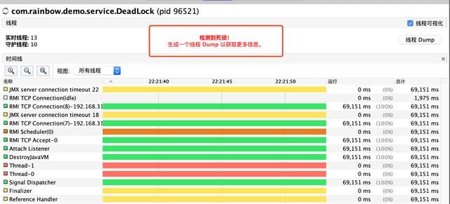 执行提示有死锁情况。在线程窗口中点击“线程Dump”按钮