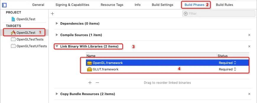 OpenGL.framework和GLUT.framework两个系统库。 -