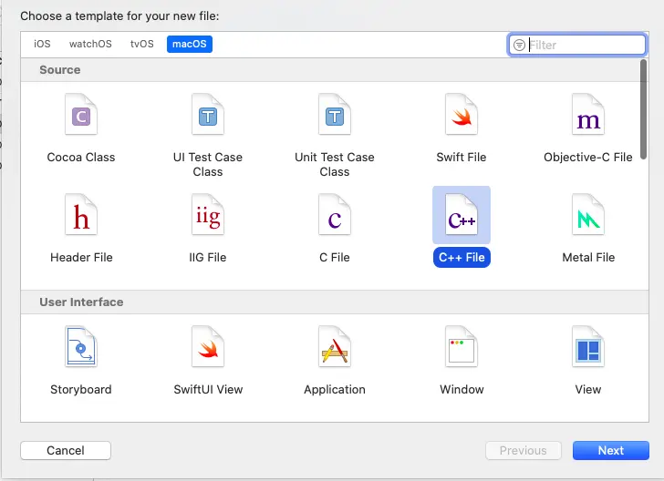 AppDelegate.h、AppDelegate.m、ViewController.h、ViewController.m和main.m文件,并创建main.cpp文件。 -