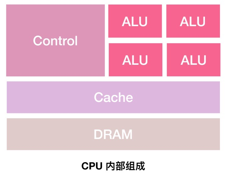 CPU拥有ALU计算单元、Control控制单元、高级缓存来协助整个系统的调转。