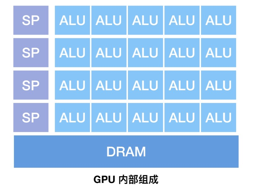 GPU拥有很多的ALU计算单元,通过计算单元来进行一个高并发的运算。每一个计算单元之间都会连接一个SP流处理器来控制这些计算