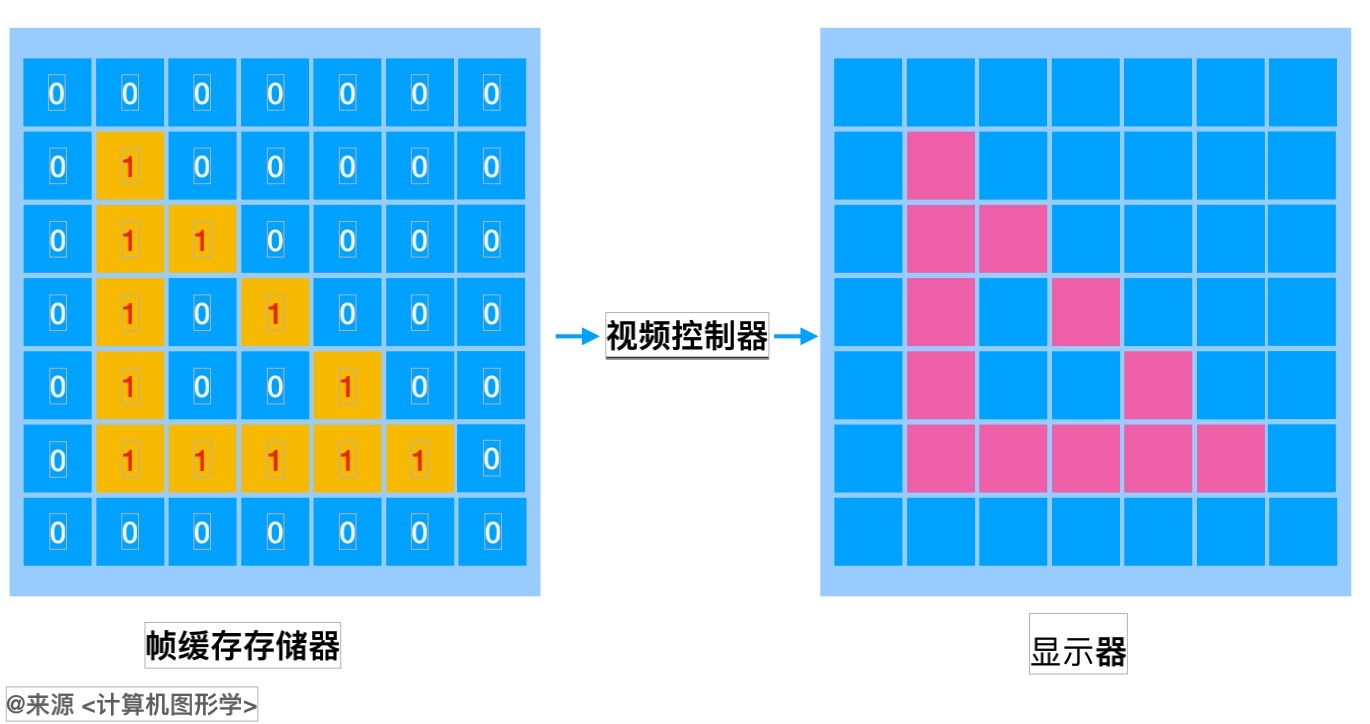 - 帧缓存区域:存储颜色值,又叫显存(显示器里需要显示的内容)。