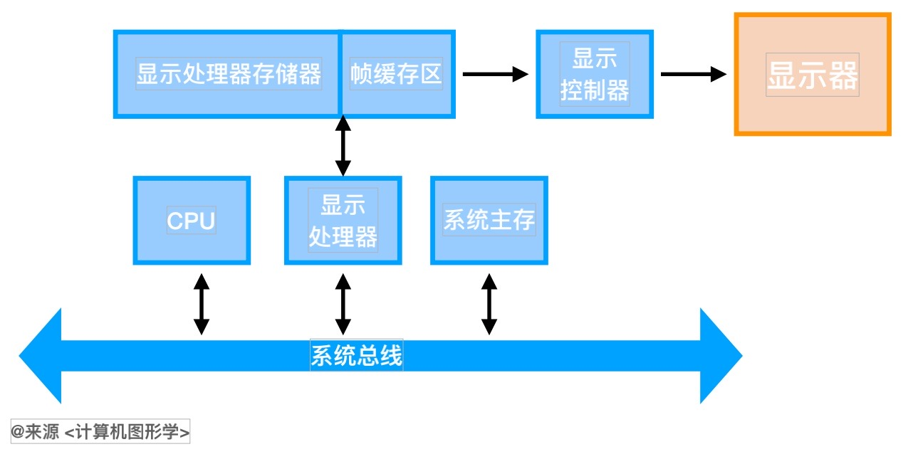 渲染流程:GPU进行渲染 -> 帧缓存区里 -> 视频控制器 ->读取帧缓存区信息(位图) -> 数模转换(数字信号转换为模拟信号) -> 显示