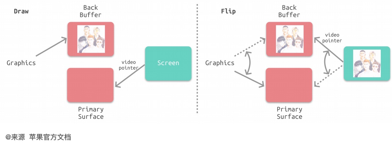 所以苹果使用一个解决策略:垂直同步Vsync + 双缓存区DoubleBuffering