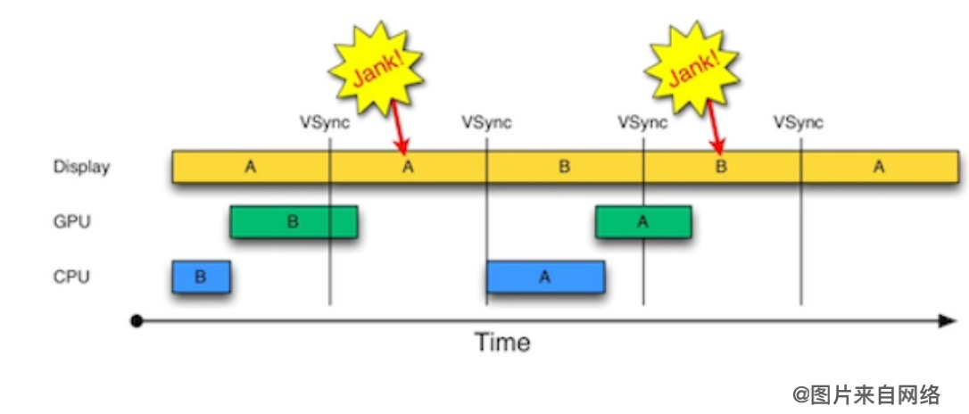 启用了这个解决策略之后会产生一个新的问题,就是会产生掉帧的情况:在接收到垂直信号的时候,CPU与GPU还没有准备好图像数据,此时屏幕就拿不到图像数据,这个时候就会发生掉帧,会重复渲染当前缓冲区的重复数据。