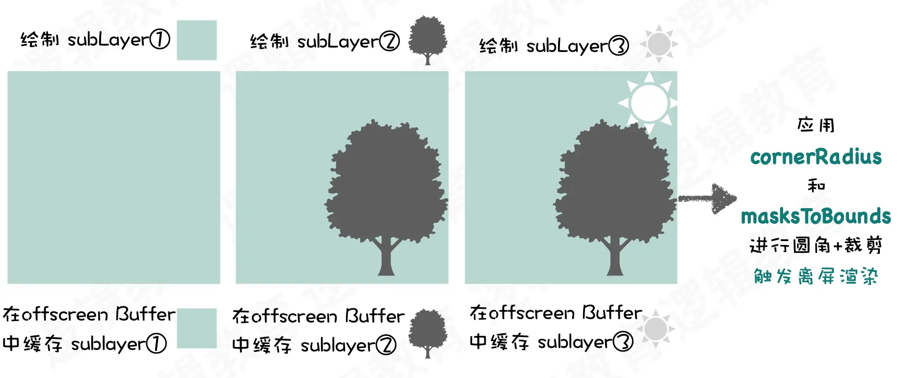 - 因为触发离屏渲染是因为需要等所有的subLayer绘制完后再进行mask或者cornerRadius等处理,处理后再缓存到frameBuffer中