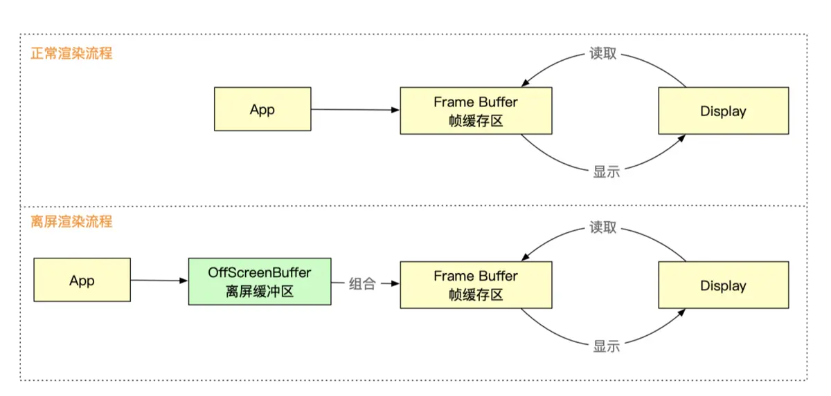 - 离屏渲染:App -> Off-Screen Buffer(进行计算合并等操作) -> FrameBuffer -> Display