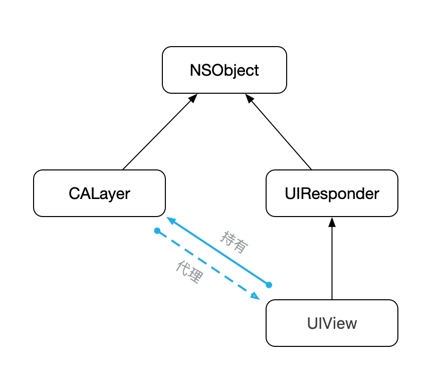 由类定义可以看出:CALayer是继承于NSObject;UIView是继承于UIResponder,UIResponder继承于NSObject。结构如下: