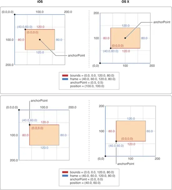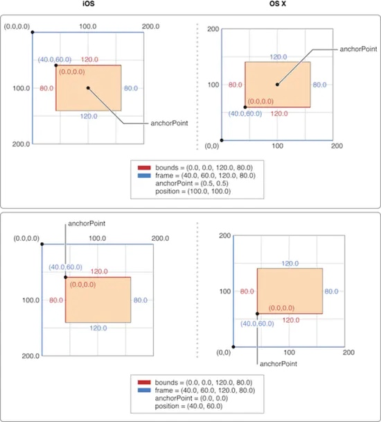 一个CALayer的布局是由它的anchorPoint, position, bounds和transform共同决定的,而UIView的frame只是简单的返回其layer的frame,同样UIView的center和bounds也是返回 其Layer的一些属性。
