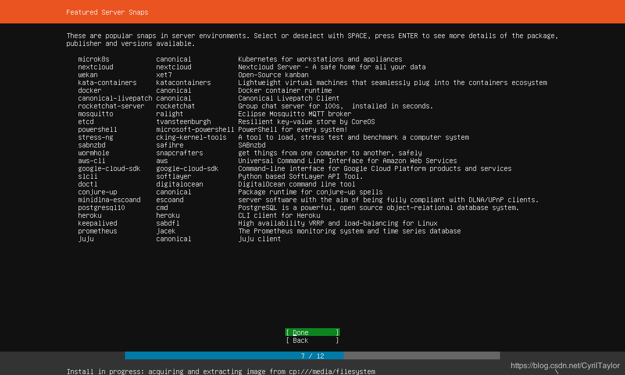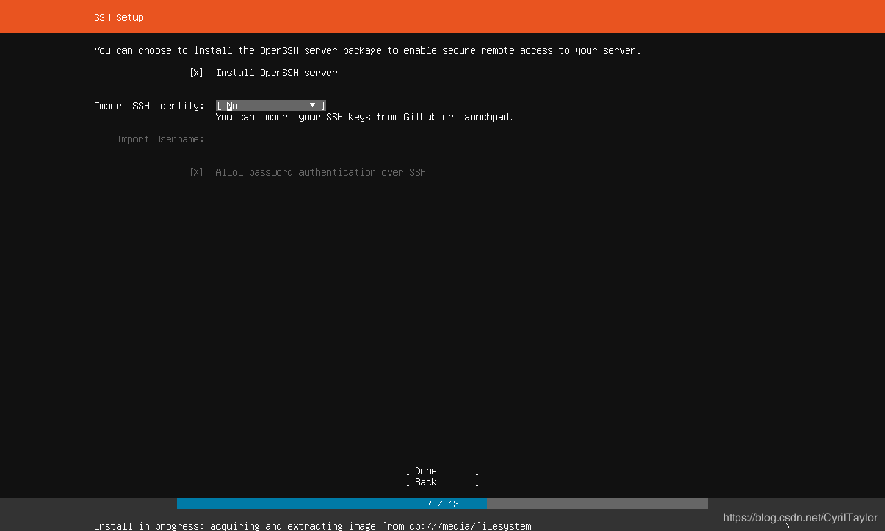 设置ssh,在Install OpenSSH server处按回车键即可选中,这个肯定是需要的,可以选择导入密钥,此处我先不导入