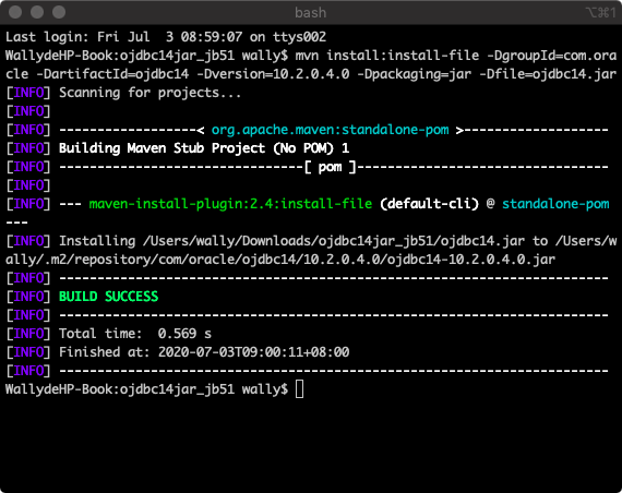 先手动下载jar包,在jar包的目录下开启终端,执行以下命令,出现build success,就为成功了!