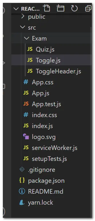 右键react-exam目录,使用vscode打开该目录。 react-exam项目目录中有一个/public和/src目录,以及node_modules,.gitignore,README.md,和package.json。