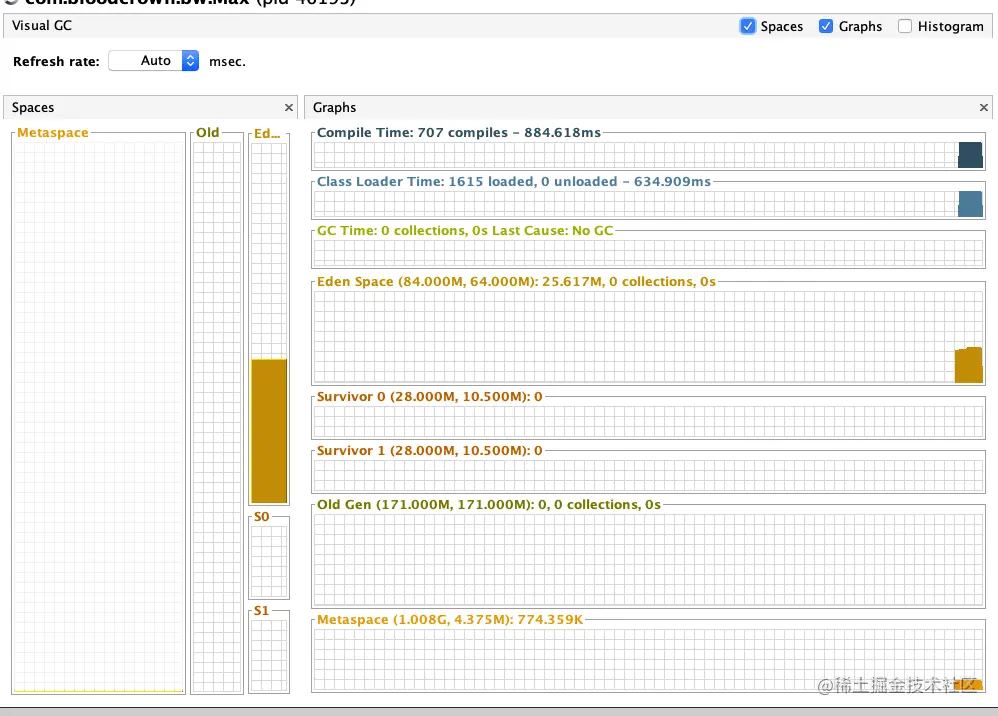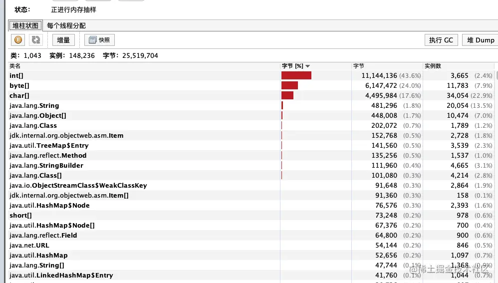 内存快照:字符数组爆了,占35M内存,这显然是字符串贡献的,Stringbuilder对象4766个,String19745个,这数量就很多了,还是在N多次GC之后