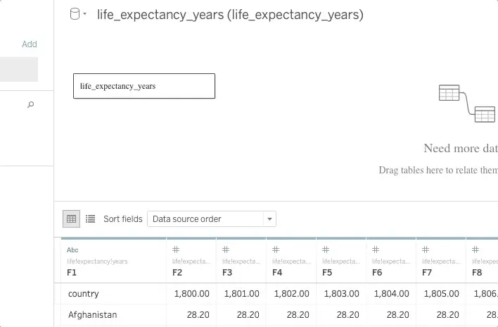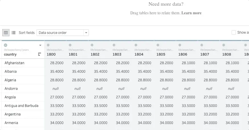 这有很多值!我们的表头出现在第一排。让我们通过右键单击“life_expectancy_years ”按钮并选择“Field names are in first row”来解决这个问题: