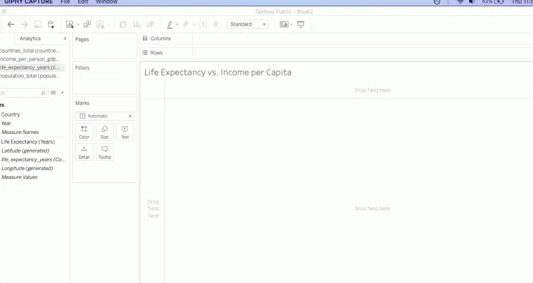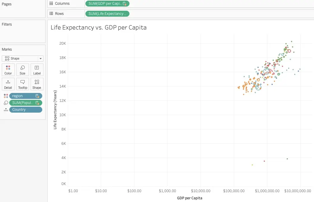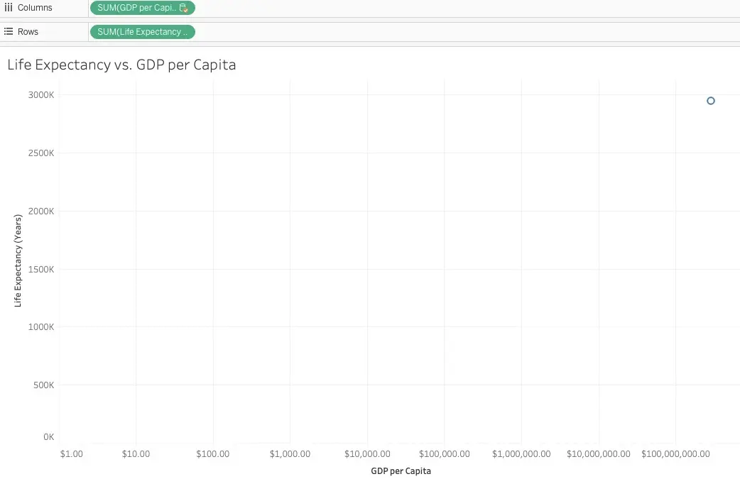 接下来,将‘Life Expectancy (Years)’特征拖放到行书架中,将“GDP per Capita”拖放到列中: