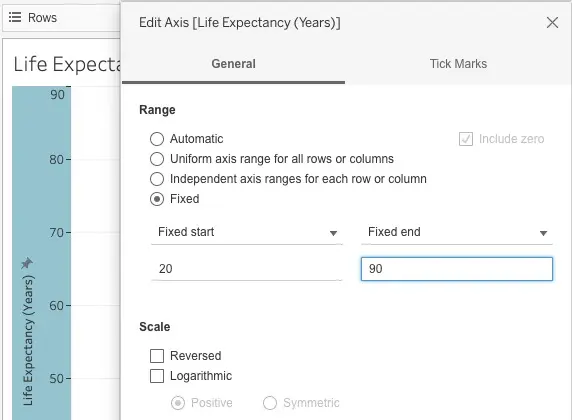 我打算把预期寿命定在20到90岁之间。右键单击Y轴并选择“编辑轴”。单击“Fixed”选项并输入值:
