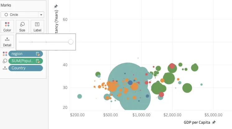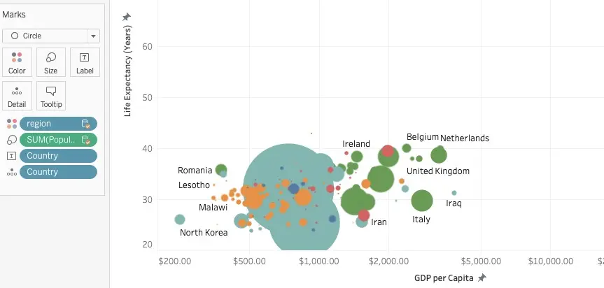 接下来,我们需要执行三个快速拖放操作。将“Population”维度放入“Marks”部分下的“Size”按钮。把“region”放进“Color”,把“Country”放进“Details”。这就是你的可视化效果: