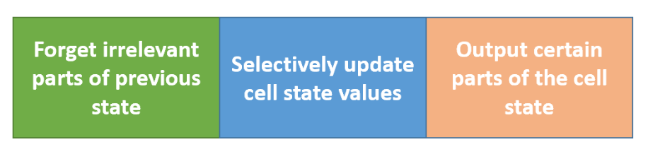 LSTM使用4个门,你可以将它们认为是否需要记住以前的状态。单元状态在LSTMs中起着关键作用。LSTM可以使用4个调节门来决定是否要从单元状态添加或删除信息。这些门的作用就像水龙头,决定了应该通过多少信息。