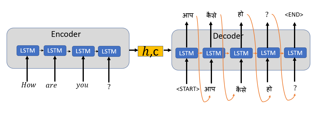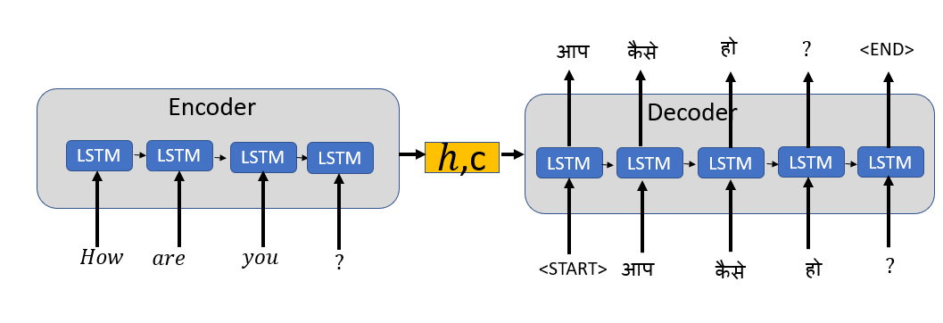 解码器预测阶段的第一时间步将具有来自编码器和<START>标记的最终状态作为输入。
