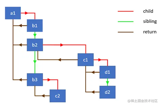 那么React如何实现算法而无需递归遍历树呢?它使用单链表树遍历算法。这样可以暂停遍历并阻止堆栈增长。