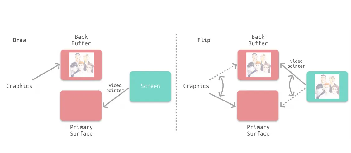 - 未解决撕裂问题,使用垂直同步+双缓存区策略造成掉帧