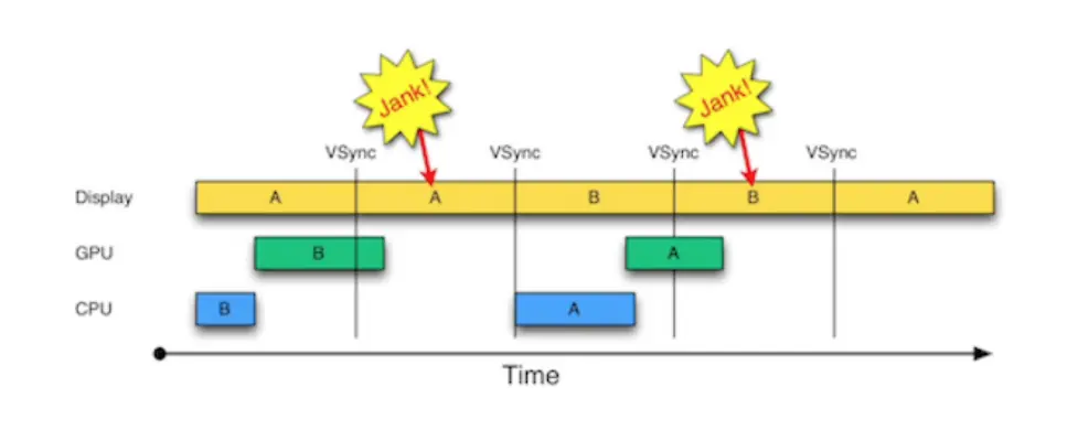 设计三缓存区进行补救,但仍旧不能完全保证解决掉帧问题,只是更合理使用CPU/GPU,减少掉帧次数。